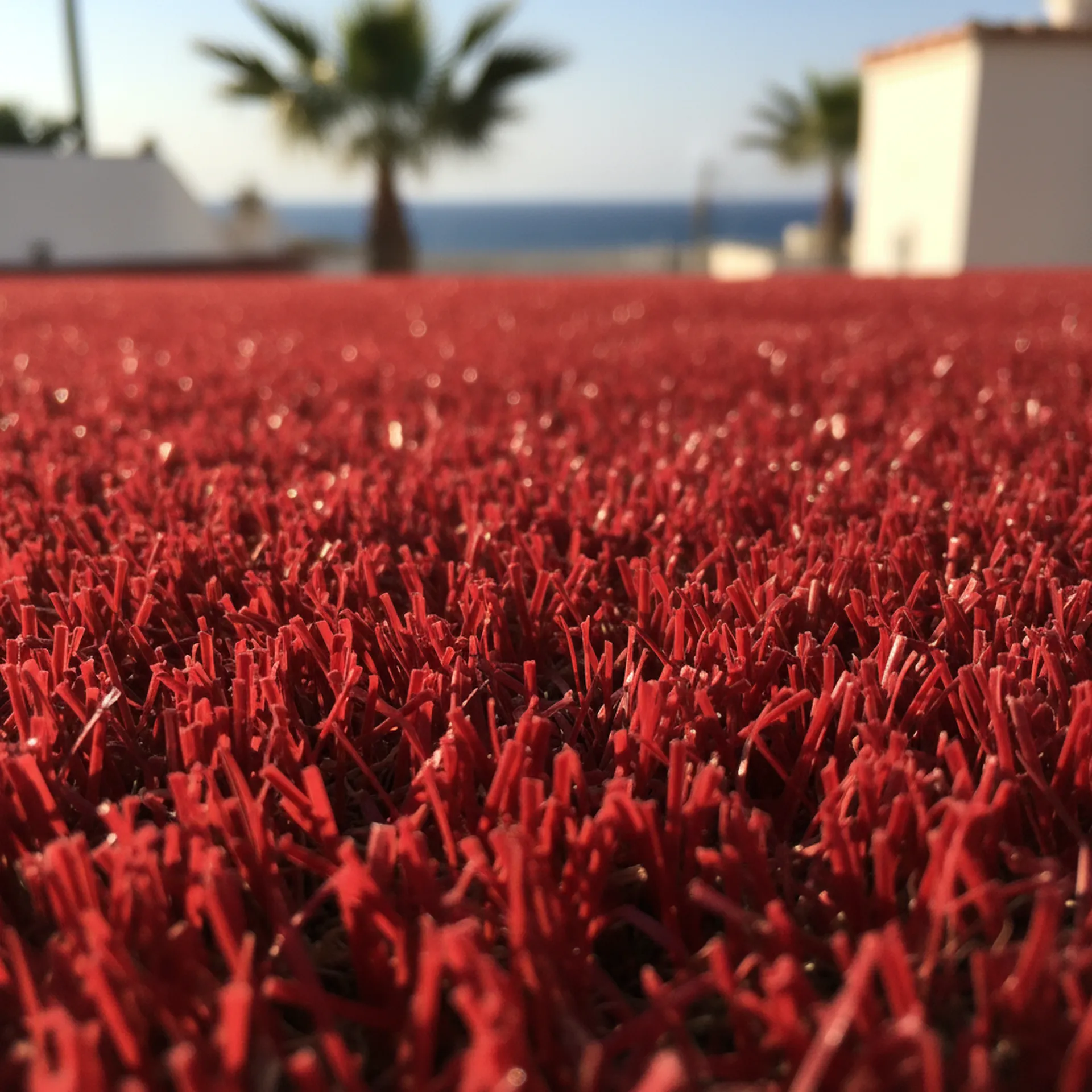 Le gazon synthétique installé à Saint-Tropez bénéficie d'un traitement haute protection contre le rayonnement solaire et le chlore, assurant une longévité optimale des pigments rouges même en bord de mer ou près d'une piscine.