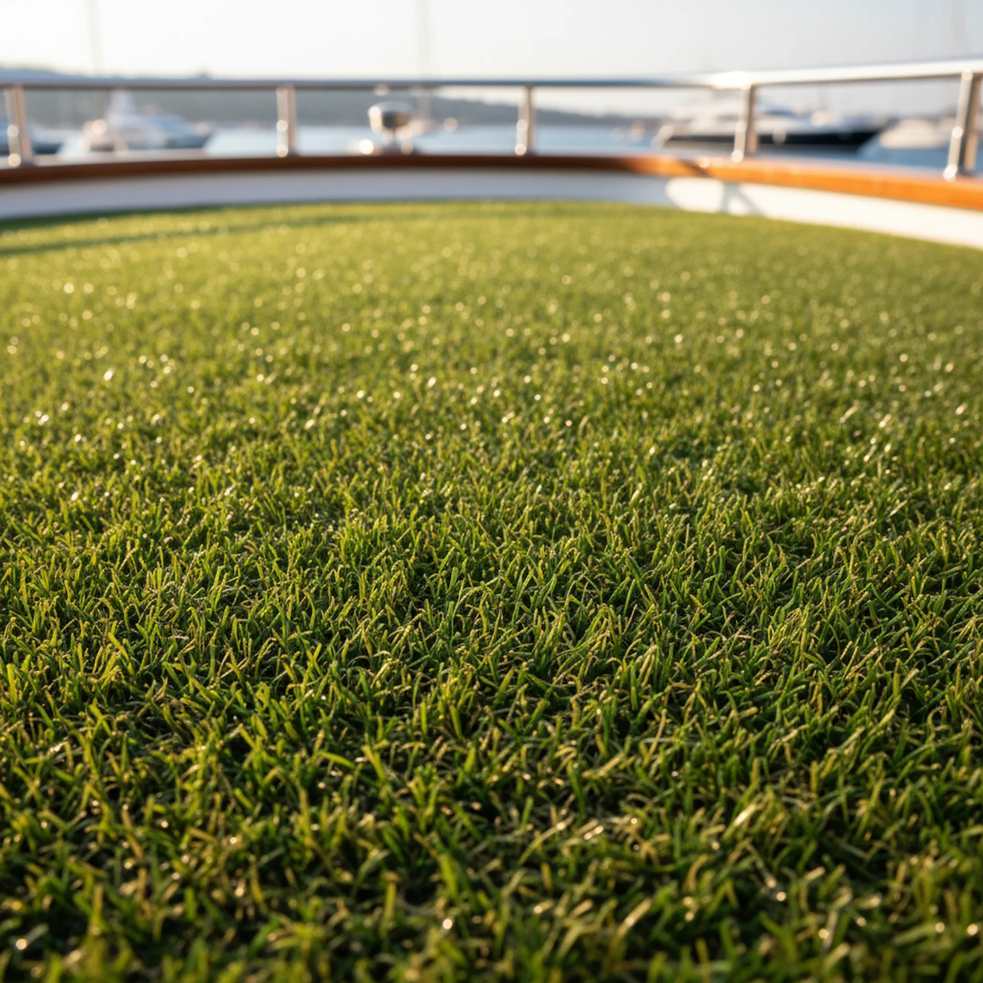 Le gazon sélectionné pour le milieu nautique possède une densité de 14000 à 25000 points par m2, ce qui lui confère une robustesse face aux passages fréquents. Sa structure en double fibre assure une résilience parfaite, même après avoir supporté du mobilier de pont lourd.