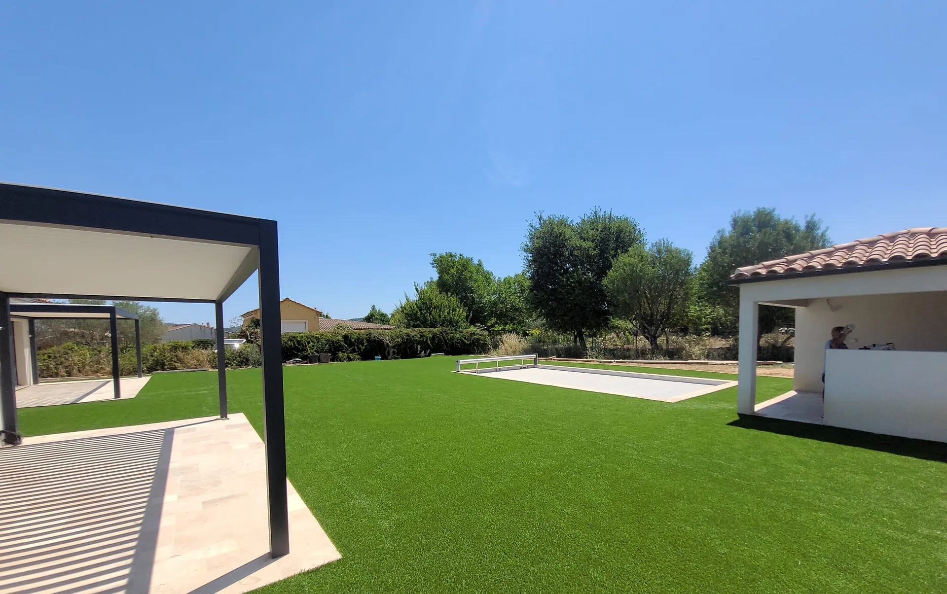 La pose s'adapte à toutes les configurations : terrains arrondis, découpe autour des arbres ou terrains en pente. Les jonctions sont réalisées avec du pan de jonction et de la colle polyuréthane ou des clous de fixation selon la nature du support. Ce revêtement made in France se décline en plusieurs coloris, mixant souvent quatre couleurs (marron, beige, vert foncé et vert clair) pour un réalisme saisissant qui s'intègre parfaitement au paysage méditerranéen. Vous pouvez également découvrir tous nos autres services pour harmoniser l'ensemble de vos extérieurs.